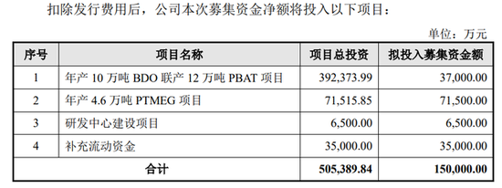 关于募投项目,根据申报材料:公司本次发行拟募集资金15亿元,用于年产10万吨BDO联产12万吨PBAT项目、年产4.6万吨PTMEG项目、研发中心建设项目和补充流动资金;公司2021年至2023年进行分红分别为4000万元、5000万元和13,728.67万元,2023年分红占净利润比重较高。