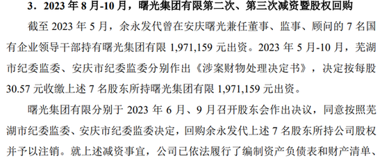 值得注意的是,招股书显示,公司实控人余永发曾代7名国企领导出资。截至2023年5月,余永发代曾在安庆曙光兼任董事、监事、顾问的7名国有企业领导干部持有曙光集团有限197万余元出资。2023年5月-10月,芜湖市纪委监委、安庆市纪委监委分别作出《涉案财物处理决定书》,决定按每股30.57元收缴上述7名股东所持曙光集团有限197万余元出资。曙光集团有限分别于2023年6月、9月召开股东会作出决议,同意按照芜湖市纪委监委、安庆市纪委监委决定,回购余永发代上述7名股东所持公司股权并予以注销。就上述减资事宜,公司已依法履行了编制资产负债表和财产清单、通知债权人、在报纸上公告等法定程序,并分别于2023年8月、10月完成减资的工商变更登记。本次股权回购完成后,上述7名股东与余永发之间的股权代持关系彻底解除,公司实际股东人数降至193人。