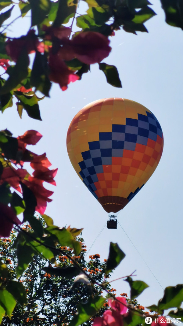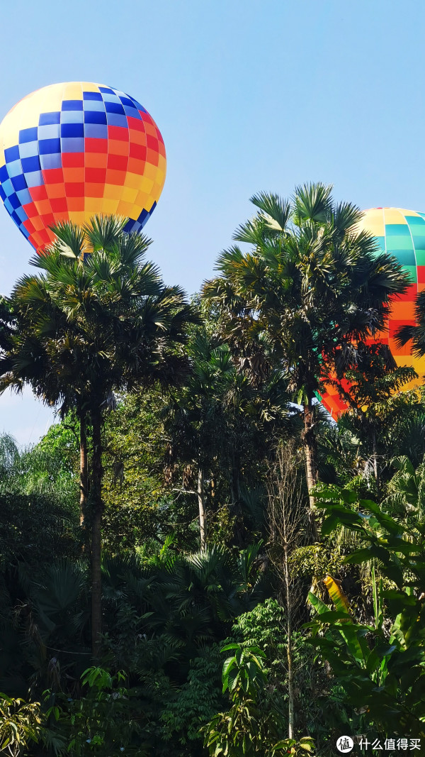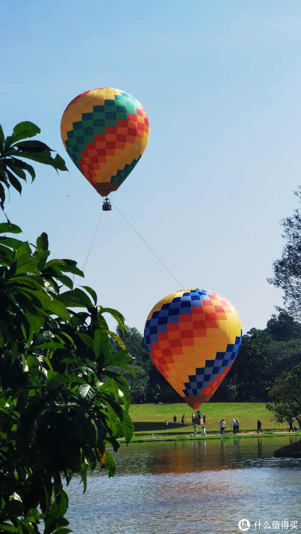 再继续走或者搭乘观光车就从热带雨林来到大片草坪池塘,颇有桃花源的味道。湛蓝天空飘荡着个个鲜艳热气球。我这种胆小鬼,是怕的,拒绝的。