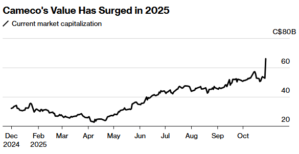 周二,全球最大铀燃料供应商之一、加拿大铀矿公司Cameco(CCJ.US)市值上涨逾 120 亿加元(约合 87 亿美元)卓信宝,其股价创下历史新高,原因是该公司旗下西屋电气宣布与美国政府达成协议,将建造至少价值 800 亿美元的新核反应堆。该股票在周二美股收盘时上涨超过 23%,而今年截至目前其涨幅已超过 100%。