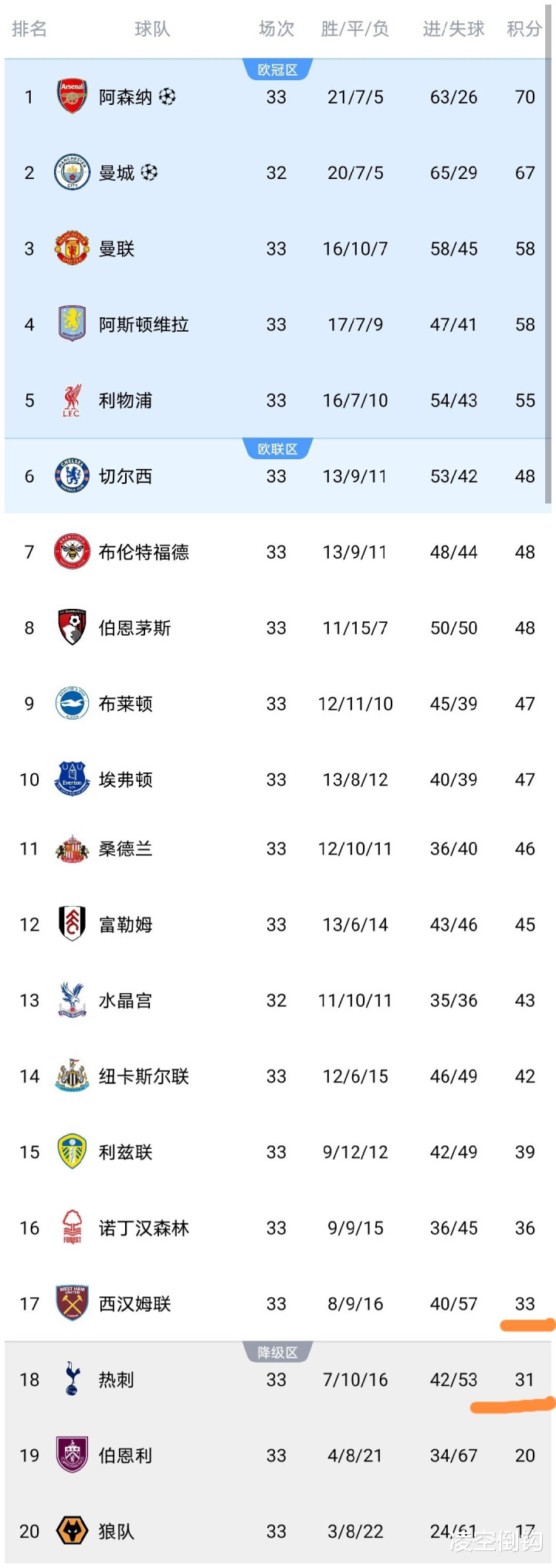 这场比赛之后,英超积分榜发生变化:西汉姆联拿到1分之后,积分上涨到了33分,领先热刺2分,热刺濒临降级,同时送狼队提前5轮降级,因为西汉姆联领先狼队16分。